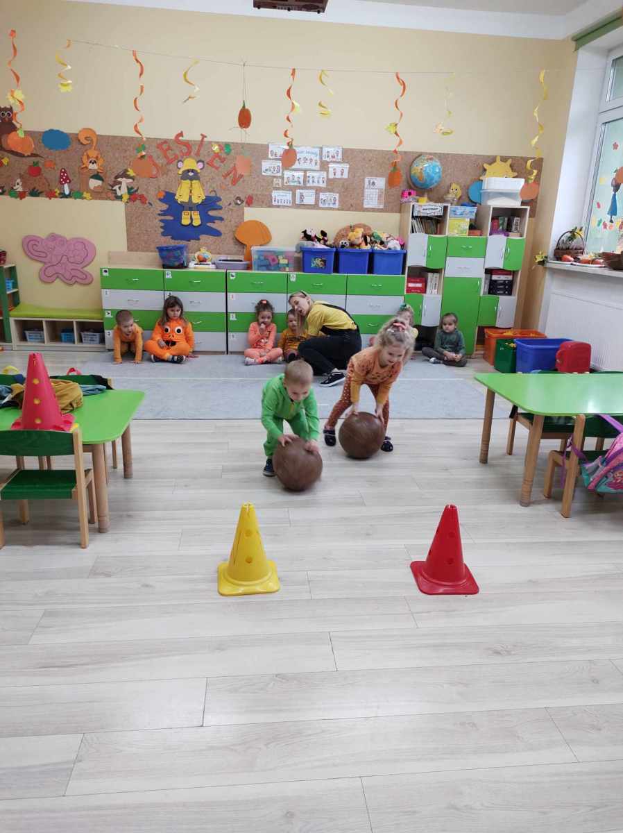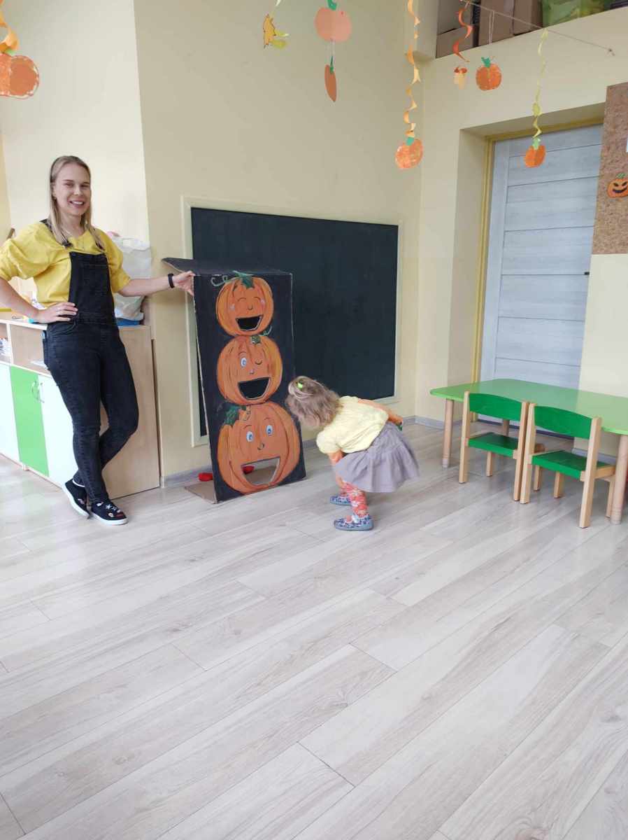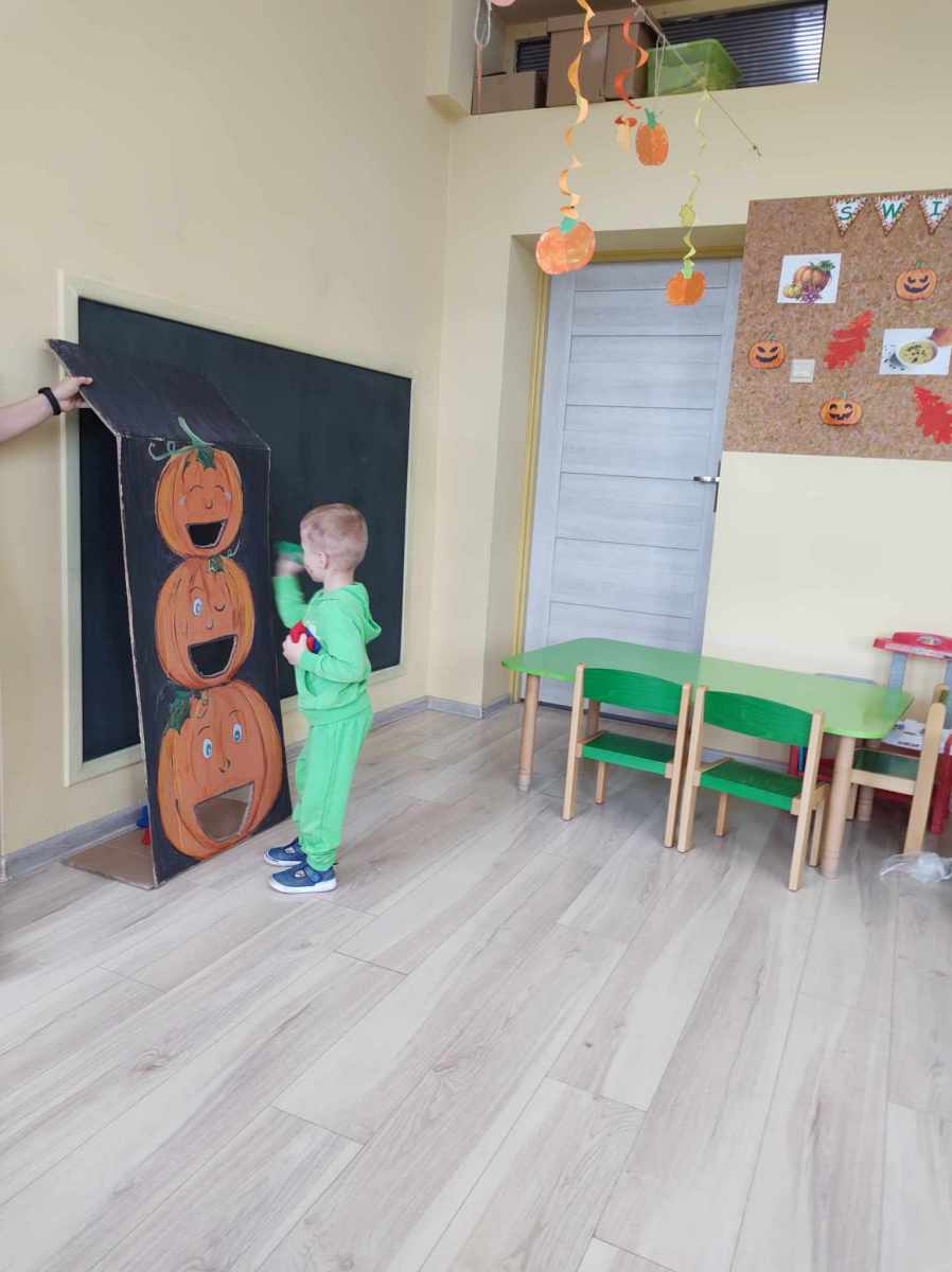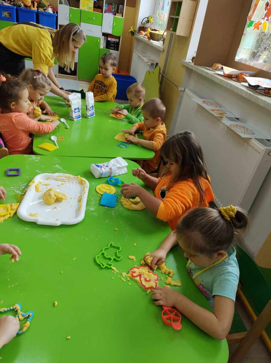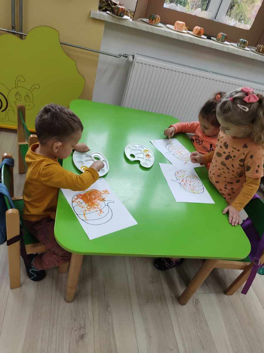 Dynię jednak można nie tylko jeść, o czym przekonały się „Jeżyki”, kiedy wspólnie zrobiliśmy dyniolinę – masę sensoryczną, którą później wycinaliśmy, wałkowaliśmy i rozgniataliśmy. Bardzo fajna alternatywa dla kupowanej w sklepie ciastoliny, a jej ogromną zaletą jest jest to, że jest zrobiona w 100% z naturalnych składników. Dzień dyni, bez dyniowych zabaw ruchowych, nie mógłby się odbyć, więc były skoki, biegi i turlanie się. Na koniec dzieci zrobiły sobie pamiątkowe zdjęcia w dyniowej fotobudce oraz otrzymały pamiątkowe medale. To był bardzo udany i radosny dzień .
