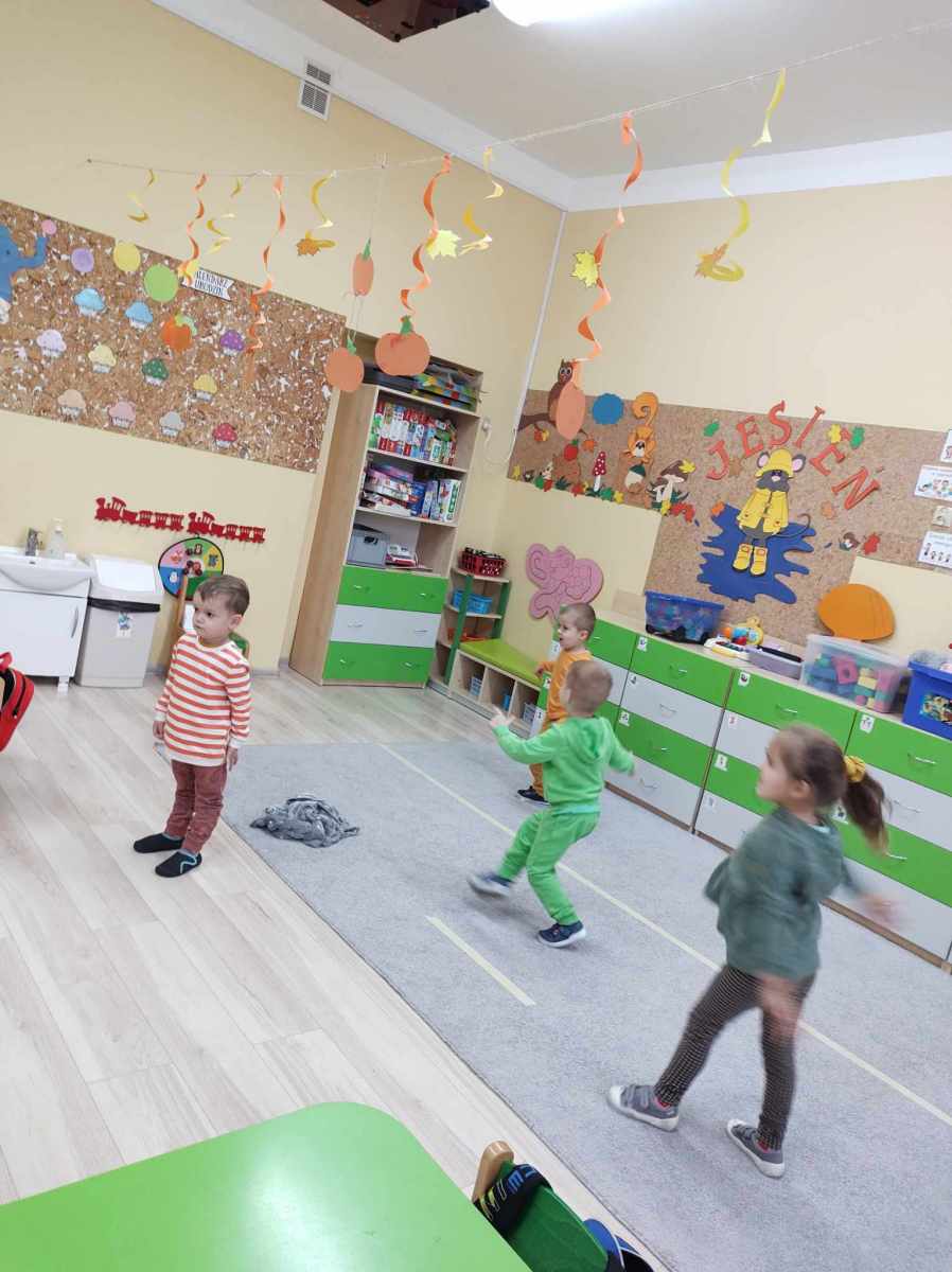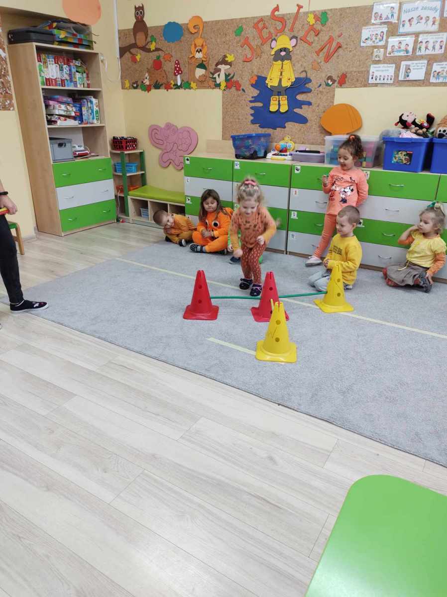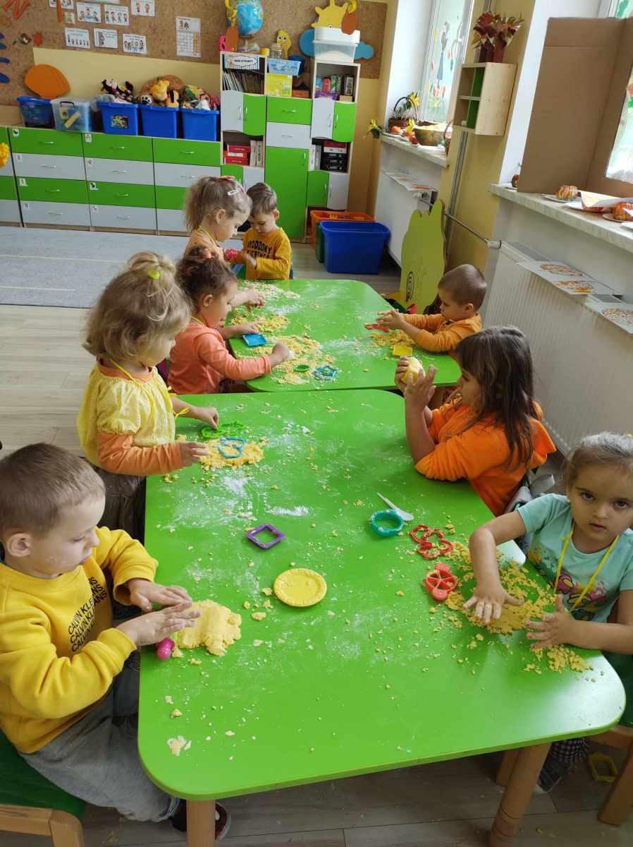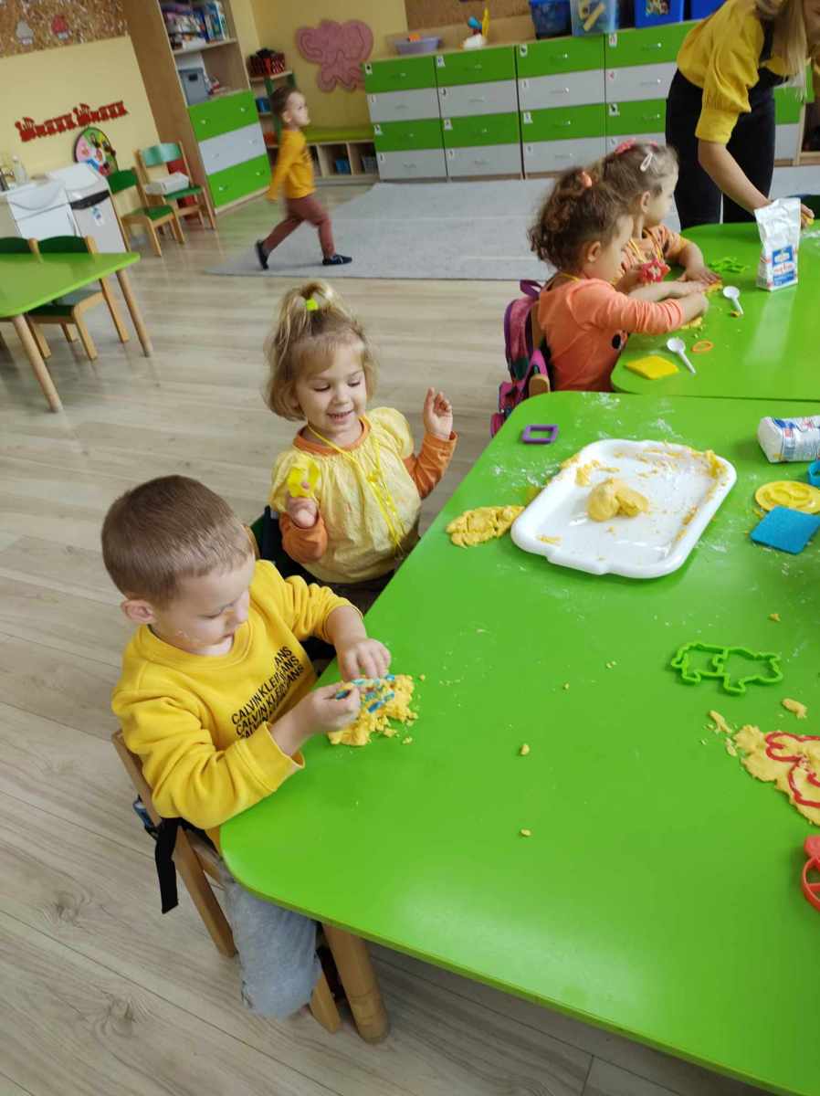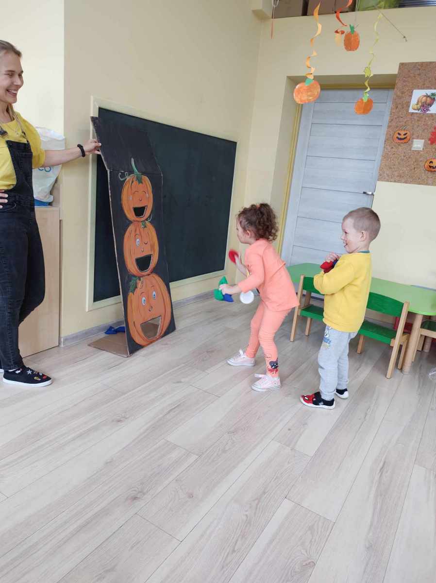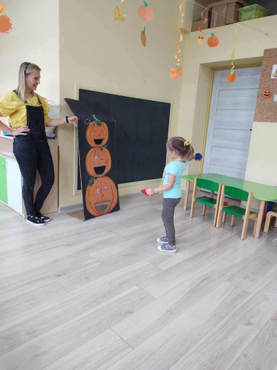 Dynię jednak można nie tylko jeść, o czym przekonały się „Jeżyki”, kiedy wspólnie zrobiliśmy dyniolinę – masę sensoryczną, którą później wycinaliśmy, wałkowaliśmy i rozgniataliśmy. Bardzo fajna alternatywa dla kupowanej w sklepie ciastoliny, a jej ogromną zaletą jest jest to, że jest zrobiona w 100% z naturalnych składników. Dzień dyni, bez dyniowych zabaw ruchowych, nie mógłby się odbyć, więc były skoki, biegi i turlanie się. Na koniec dzieci zrobiły sobie pamiątkowe zdjęcia w dyniowej fotobudce oraz otrzymały pamiątkowe medale. To był bardzo udany i radosny dzień .
