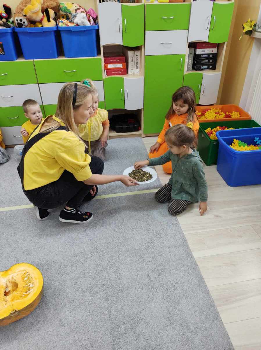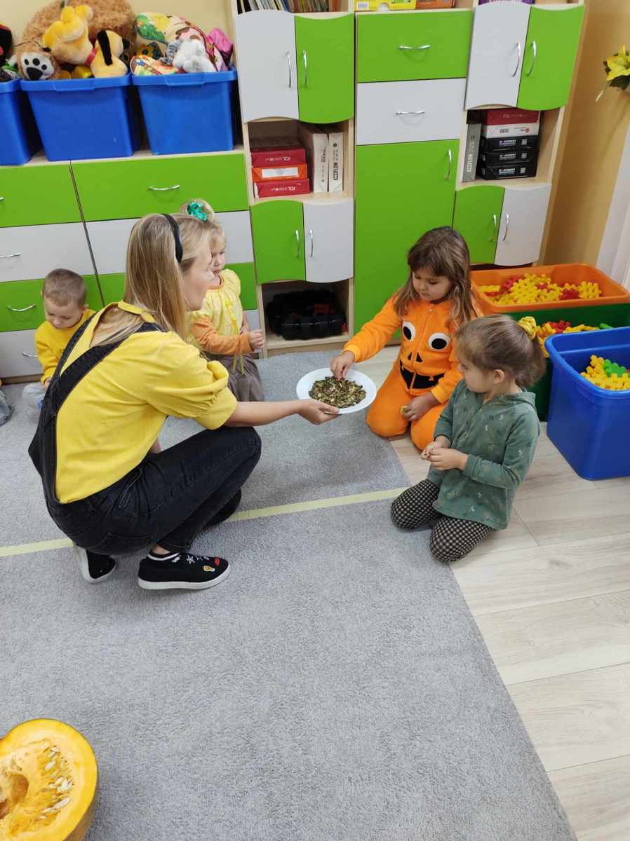 nie zawiodły się widokiem pestek, które po skosztowaniu, okazały się równie smaczne . Maluchy miały także okazję spróbować dyniowych babeczek pieczonych specjalnie na tę okazję .