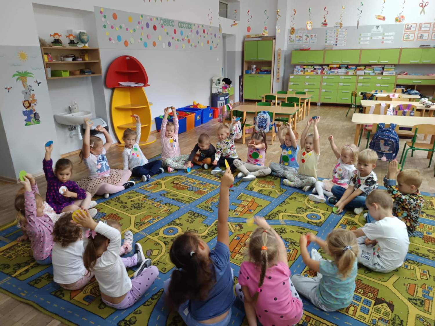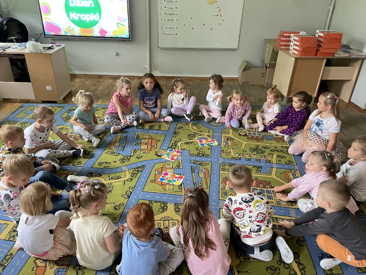 Tego dnia dostrzegaliśmy kropki tam, gdzie wcześniej nie wszyscy zwracaliśmy na nie uwagę. Okazało się, że kropki towarzyszą nam w naszym codziennym życiu: są w kropkach biedronki, zegarze,  choinkowej bombce, kolorowej kuli, piłce;  z kropki można utworzyć słońce.