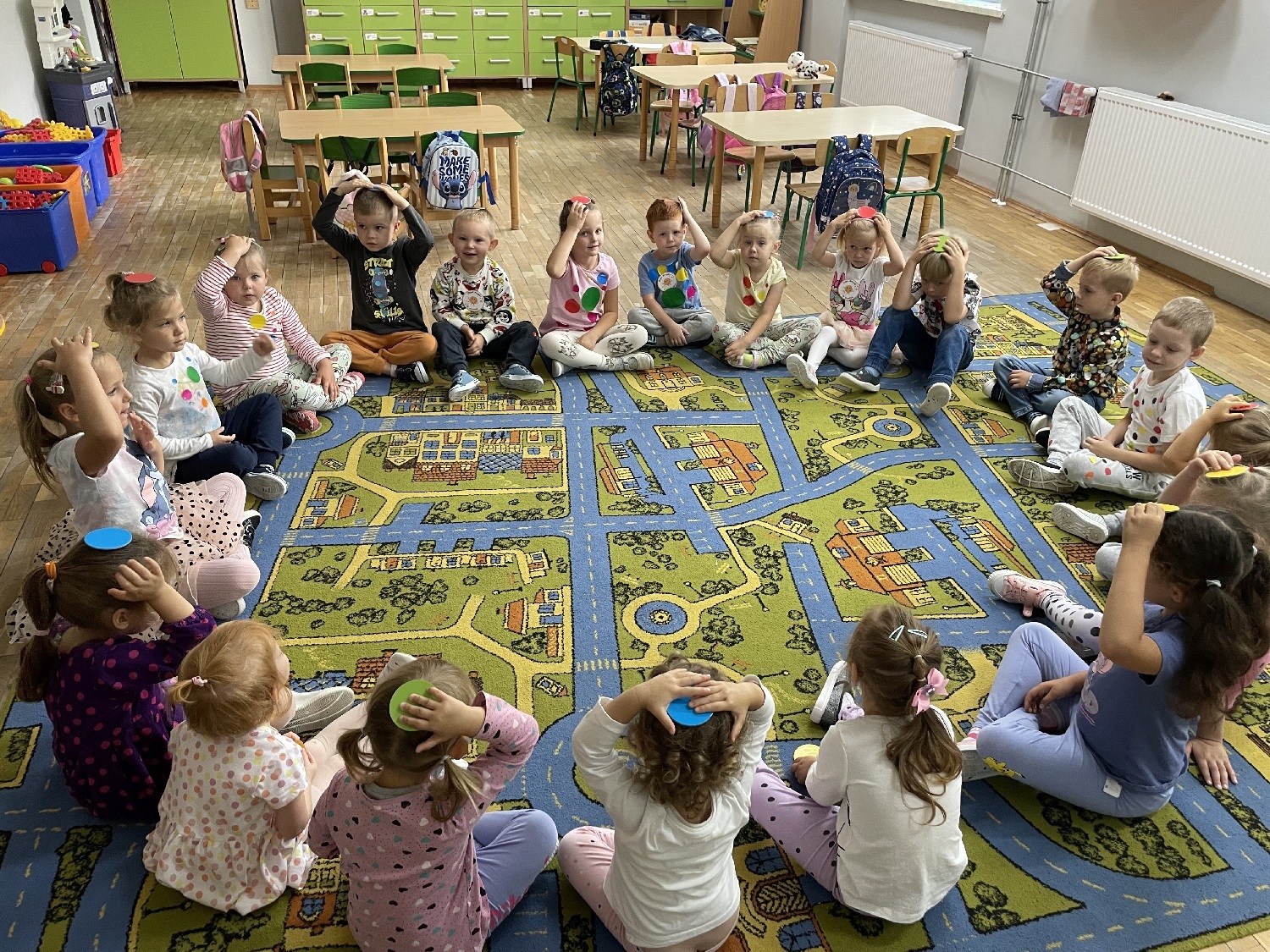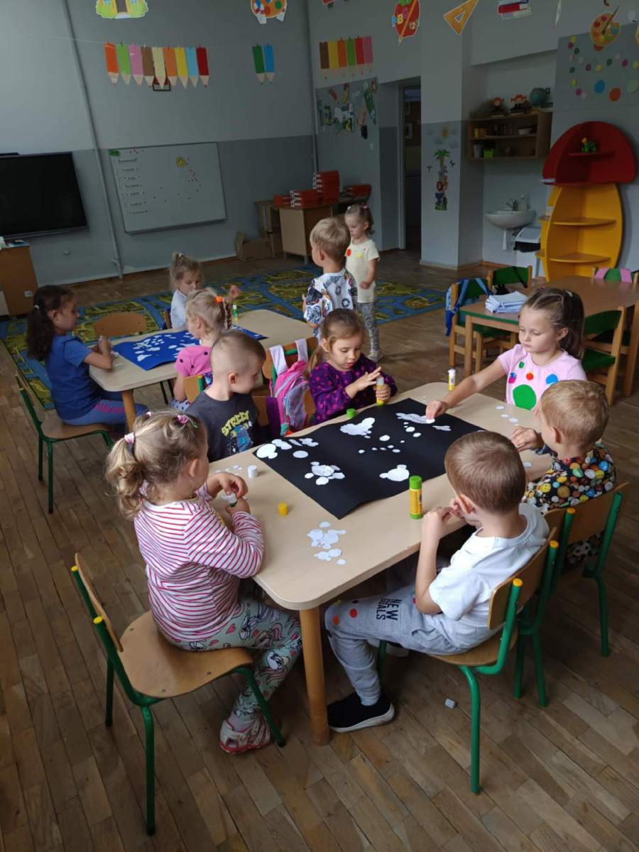 Poza liczeniem kropek, zabawami ruchowymi i śpiewaniem piosenek przedszkolaki wykonały prace plastyczne, oczywiście z kropką w roli głównej. Sześciolatki wykonały kompozycje z kółek różnej wielkości rozwijając przy tym swoje twórcze myślenie i kreatywność.
