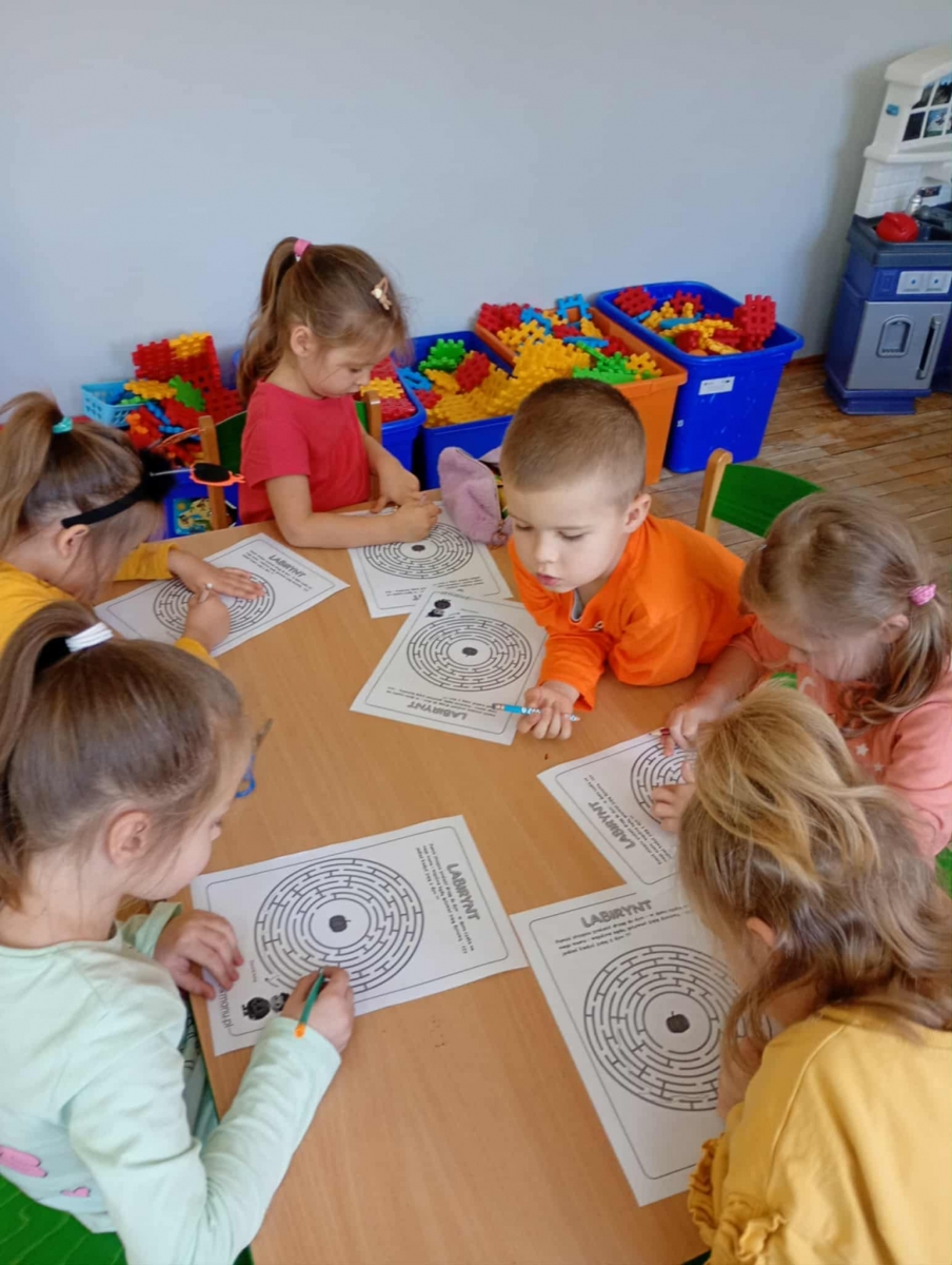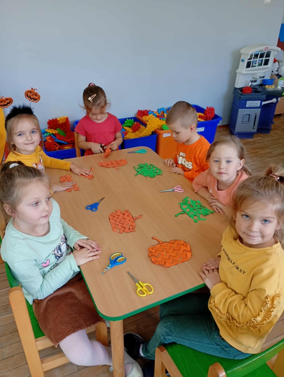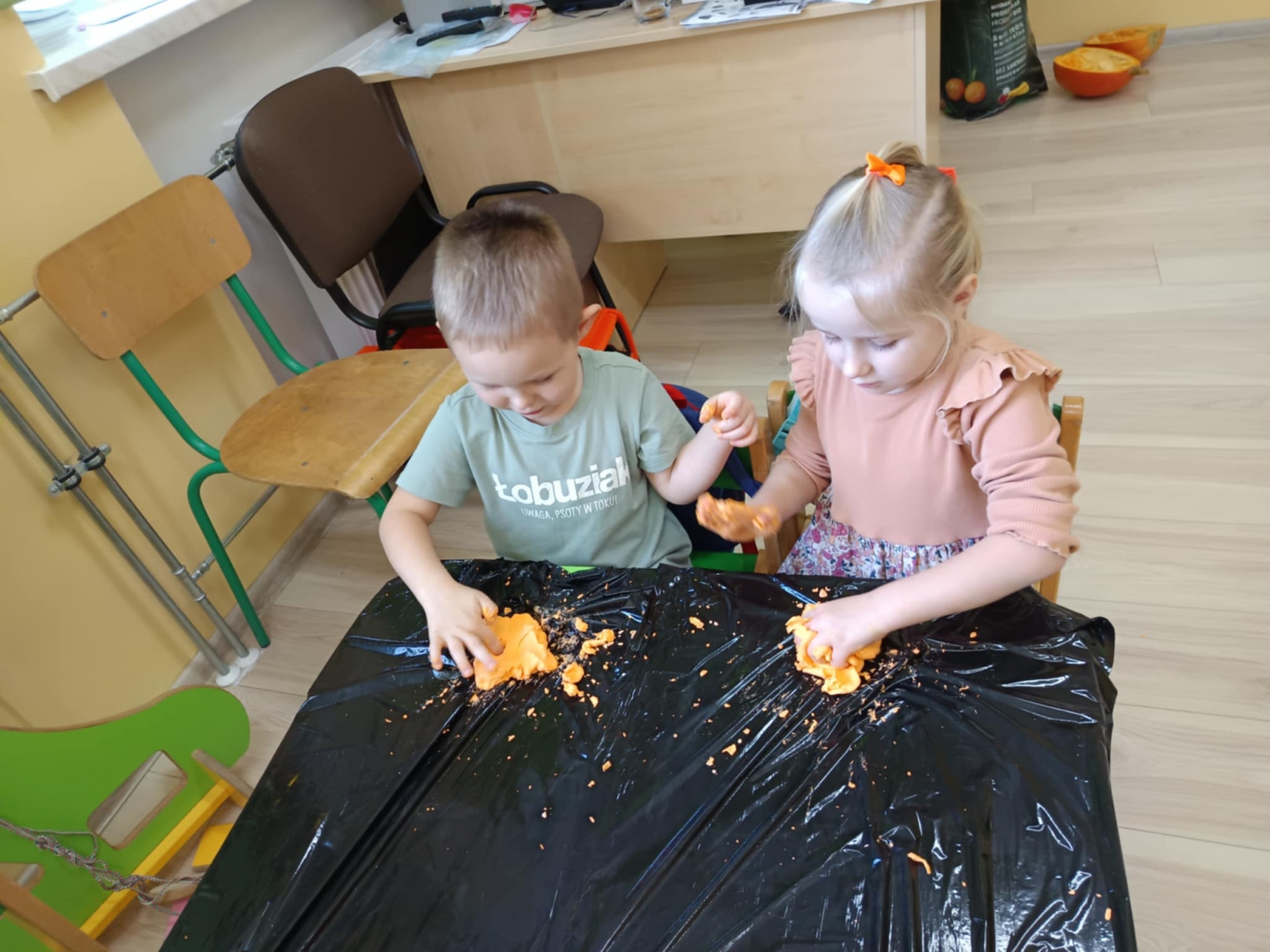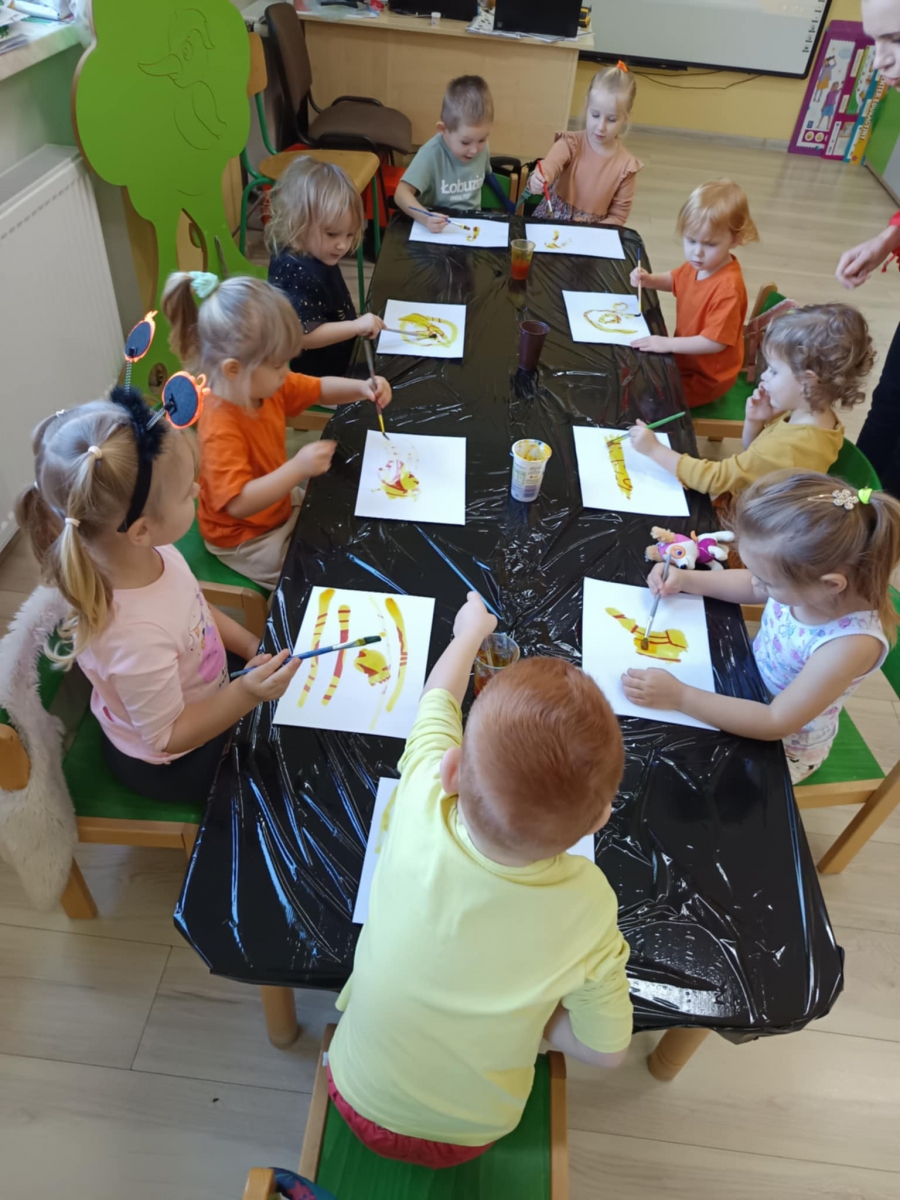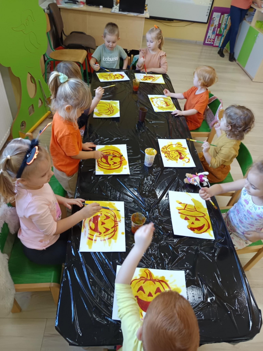 Podczas zajęć dzieci kodowały z użyciem dyń, „czarowały” dyniowe obrazki malując kurkumą, zbierały paluszkami pomarańczowe kropelki i wypełniały nimi dynie. Nie zabrakło również zabaw sensorycznych – największe emocje wzbudziło lepienie z pomarańczowej piankoliny. Dzieci z radością ugniatały, lepiły i eksperymentowały z nową, miękką strukturą.
