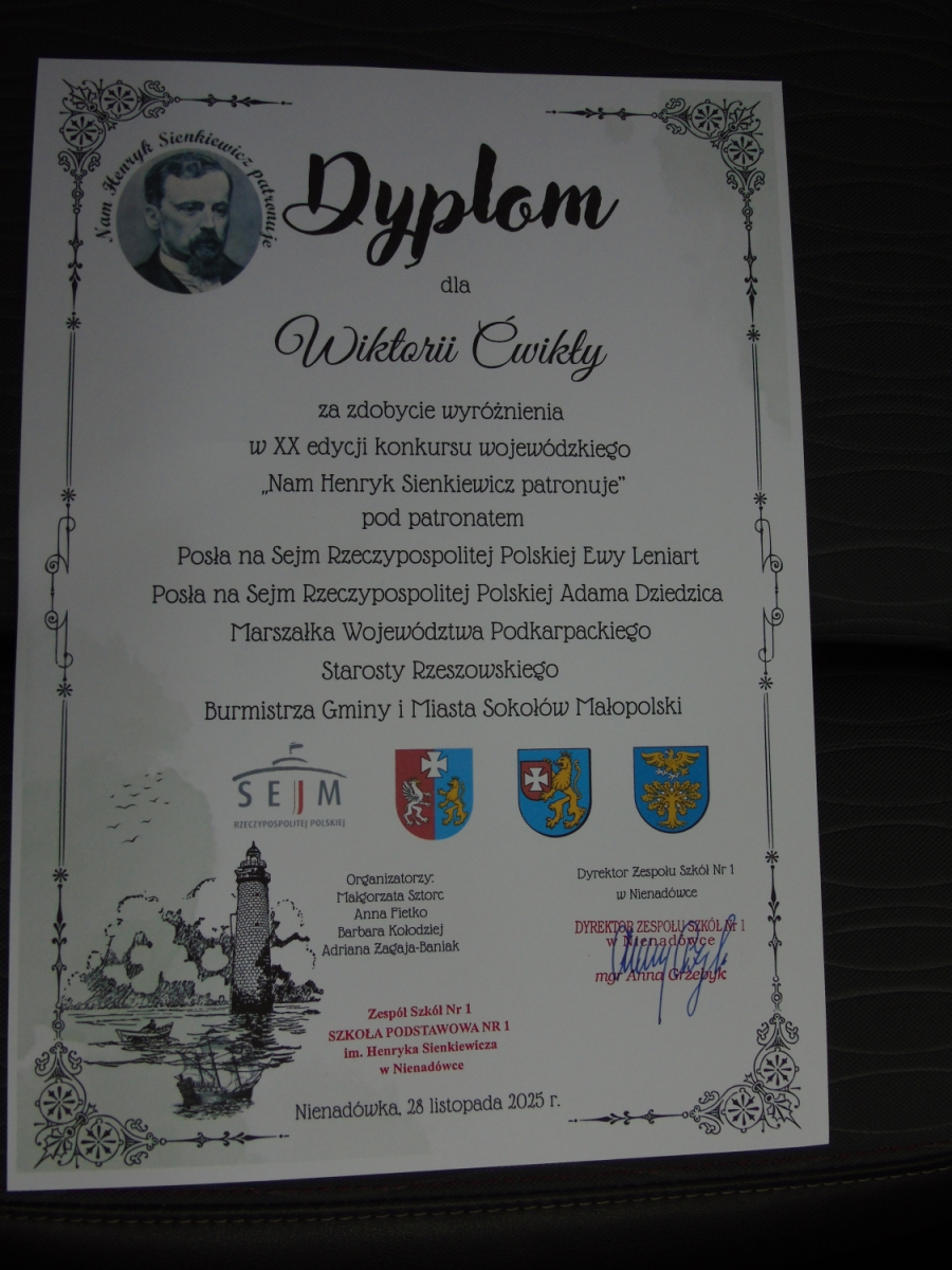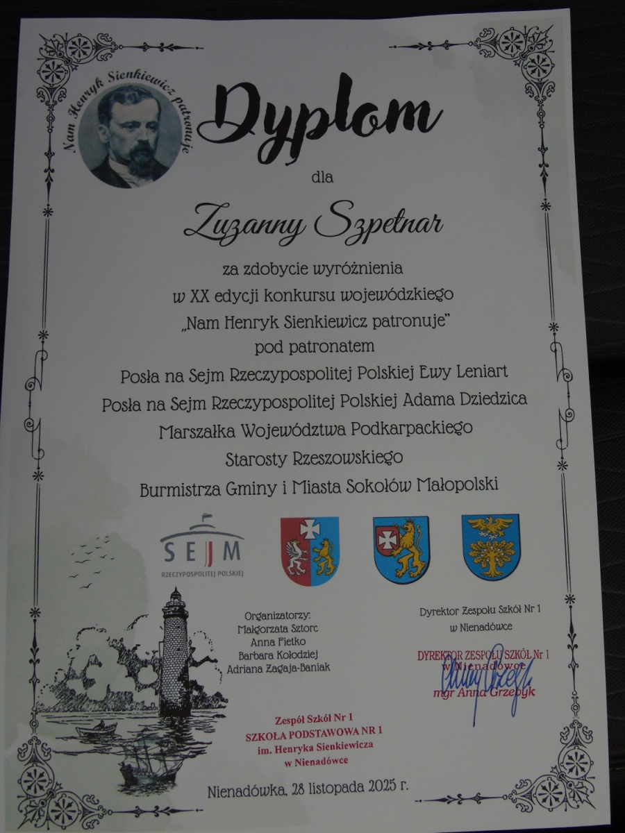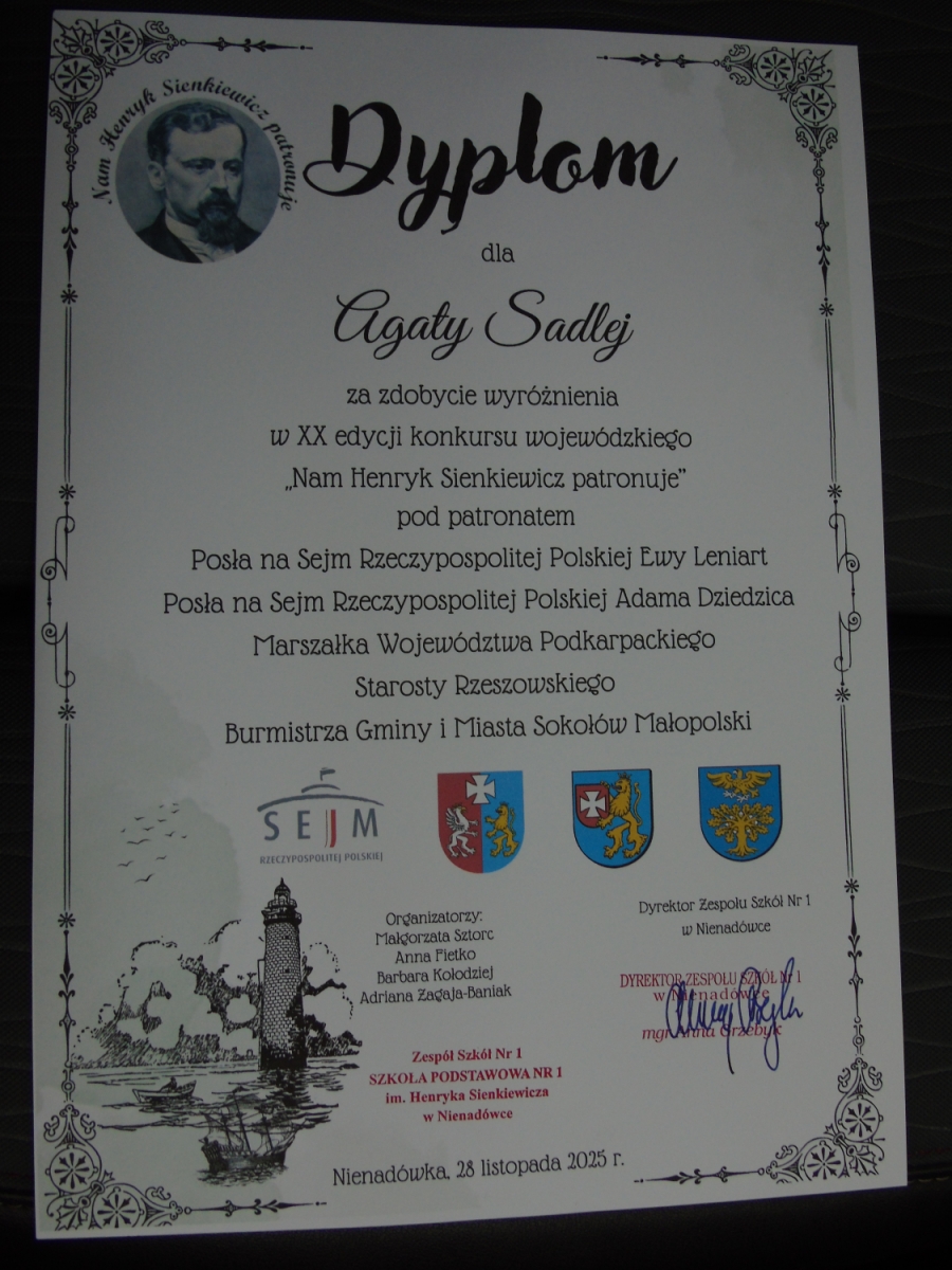 Uroczyste wręczenie nagród laureatom jubileuszowej, XX edycji Wojewódzkiego Konkursu „Nam Henryk Sienkiewicz patronuje” zgromadziło w Zespole Szkół nr 1 w Nienadówce uczniów, ich opiekunów oraz znamienitych gości. Wśród grona laureatów znalazły się trzy uczennice naszej szkoły – Agata Sadlej z kl. IV, Wiktoria Ćwikła z kl. VI oraz Zuzanna Szpetnar z kl. VI, które pod kierunkiem pani Haliny Kyci zdobyły wyróżnienia w kategorii praca literacka.