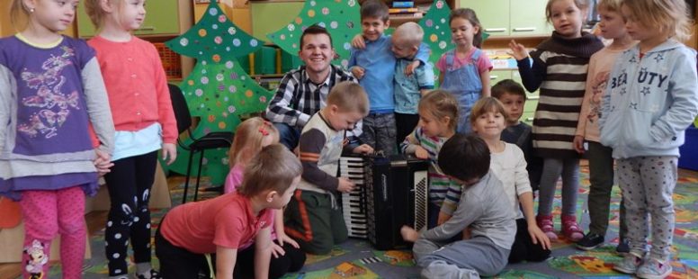 Akordeon to jest to, co przedszkolaki lubią najbardziej! Muzyka – bodźcem słuchowym, który wymusza aktywność dziecięcą. Bardzo miła niespodzianka spotkała dzieci z oddziałów przedszkolnych – na zaproszenie dyrektor szkoły Małgorzaty Leja dzieci odwiedził Adrian Kyć, absolwent Szkoły Podstawowej i Gimnazjum w Dąbrowicy, który pięknie gra na akordeonie. Na początku gość naszej szkoły przedstawił dzieciom wygląd i działanie instrumentu, opowiedział też o zasadach gry na nim.
